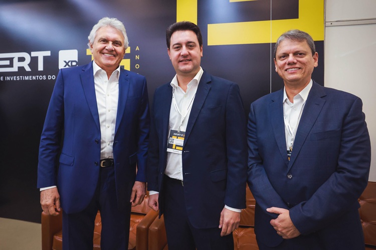 Ronaldo Caiado ao lado de Ratinho Jr, do Paraná, e Tercísio de Freitas, de São Paulo em evento da Expert XP 2025